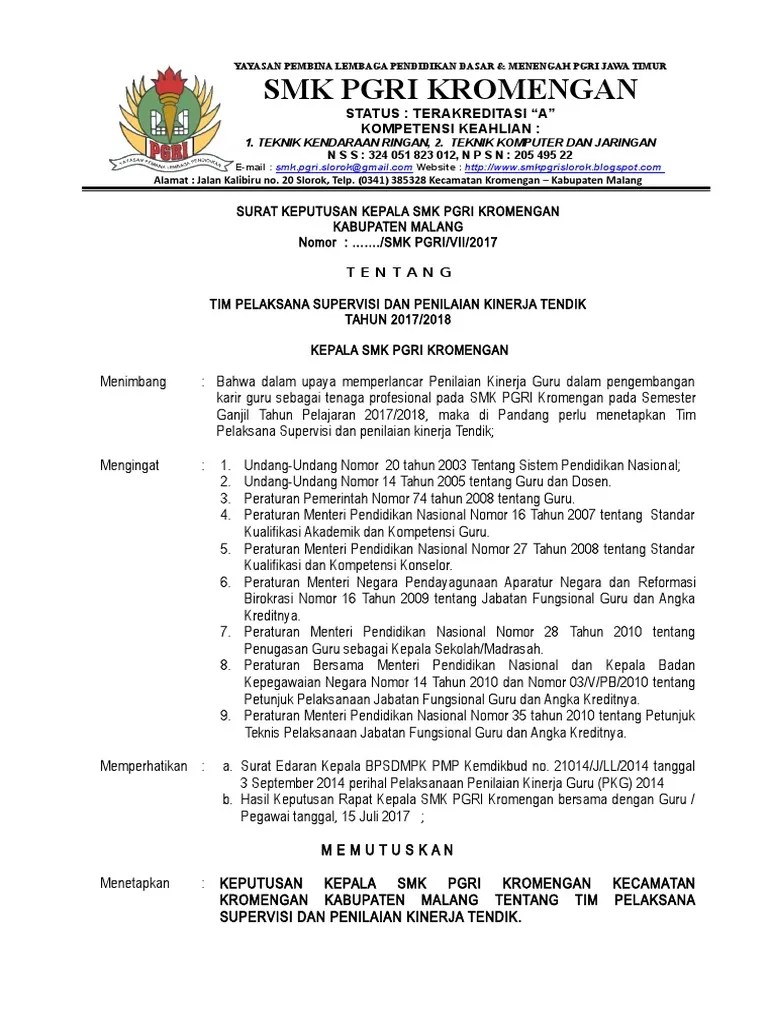Contoh Sk Tim Penilaian Kinerja Guru : Sk Tim Penilai Pk Guru Doc Document : Bahwa dalam upaya memperlancar penilaian kinerja guru dalam pengembangan karir guru sebagai tenaga .. T e n t a n g. Bahwa agar penilaian kinerja guru dapat dilaksanakan sebagimana mestinya, maka perlu dibentuk tim penilai kinerja guru. Bahwa dalam rangka melaksanakan peraturan menteri negara pendayagunaan aparatur negara dan reformasi birokrasi nomor 16 tahun . Khusus yang memiliki misi mengembangkan jabatan profesi guru melalui kegiatan penilaian kinerja guru (pkg). Profesi guru perlu dikembangkan secara terus menerus dan proporsional menurut jabatan fungsional guru,penilaian kinerja guru (pk guru) yang .