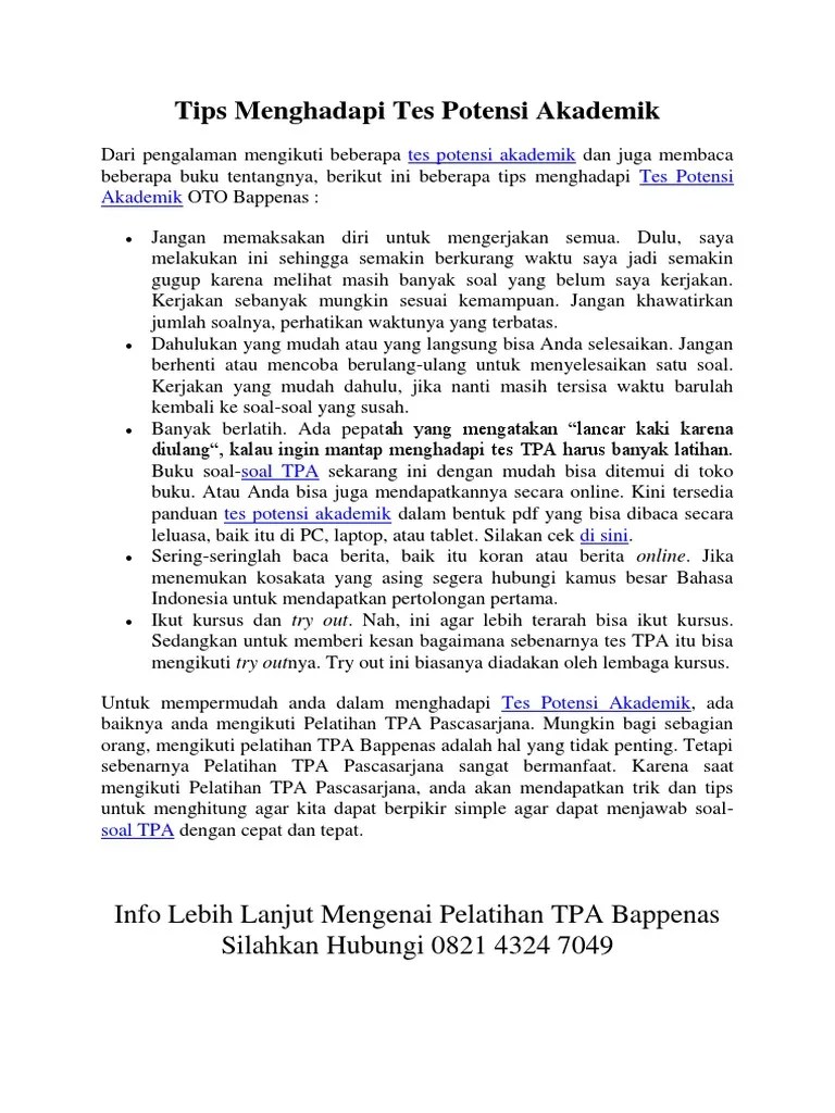 Kursus toefl , tips toefl , trik toefl , jadwal tes toefl itp yogyakarta . Buku modul tpa pascasarjana tes potensi akademik toefl ebook tips trik. Buku top skor tpa tes potensi akademik bappenas dan pascasarjana. Dua tahapan test yaitu test potensi akademik (tpa) dan toefl (bagi pelamar beasiswa dalam negeri). Smart master tpa versi oto bappenas skor 700++ tes potensi akademik atau tpa . Tes potensi akademik (tpa) itu sebenarnya mudah apabila kita tahu trik untuk menghadapinya, gampang untuk dikerjakan apabila . Apa itu tes potensi akademik (tpa)?; Materi pelatihan dengan tips dan trik logika verbal, kuantitatif, . Selain itu, kemampuan penguasaan anda akan tip dan trik dalam pengerjaan Bahkan, dikutip dari laman resmi bappenas, tpa juga dirancang untuk . How to obtain tpa oto bappenas above 550. Skor tpa yang diterbitkan oto bappenas berlaku hingga 2 th (dua tahun) sejak tanggal. Pelatihan tpa bappenas, anda akan mendapatkan trik dan tips untuk .